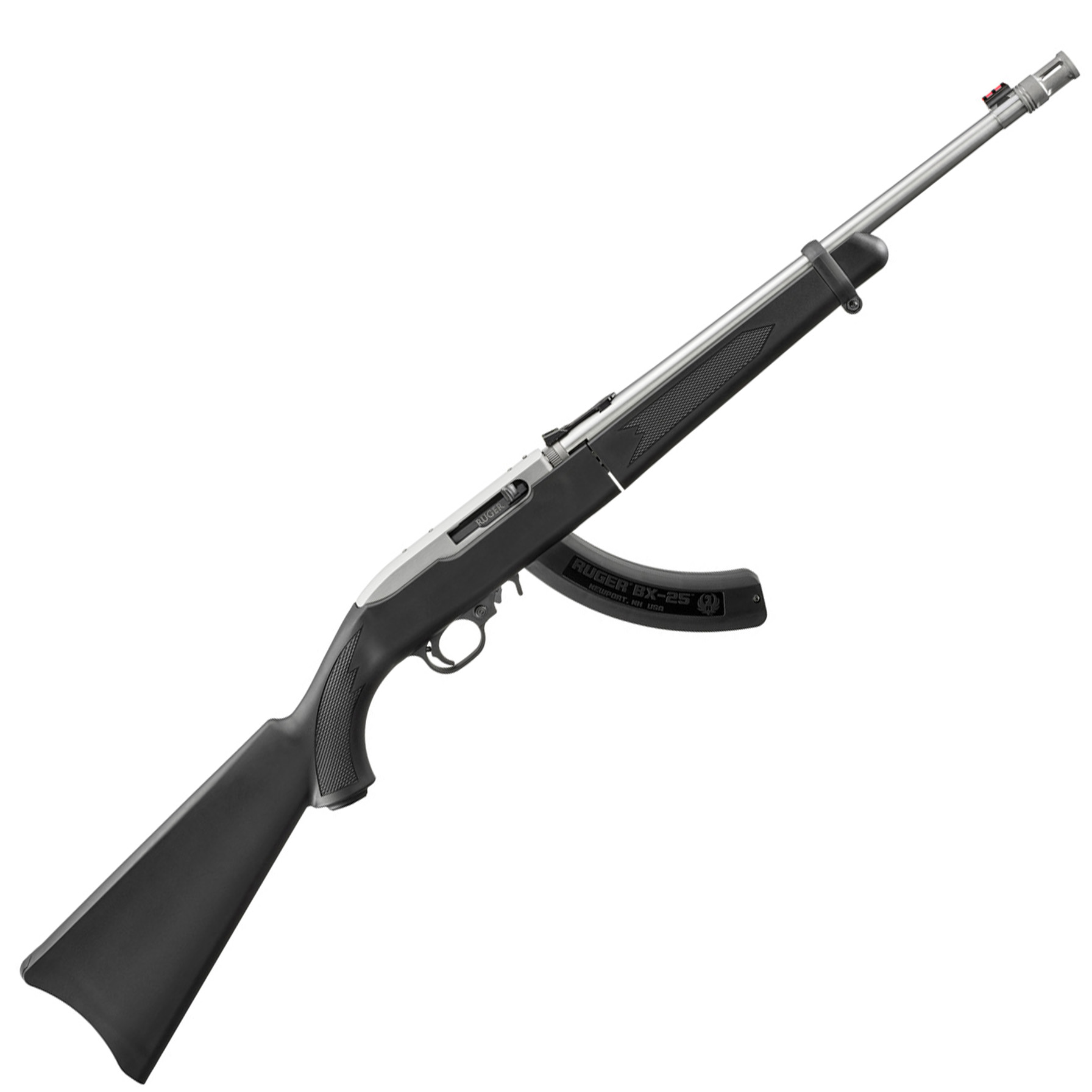 10/22 22LR 18.5 SS BBL TAKEDOWN BLACK SYN STK BX-Trigger, match bolt release, fiber optic front and rear sights 18.5″ Stainless Steel Barrel With Flash Suppressor Black Synthetic Stock