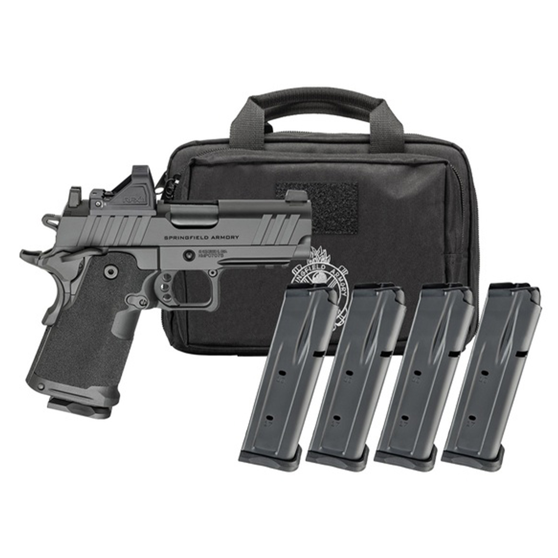 Springfield 1911 DS Prodigy 3.5″ Compact AOS 9mm Tritium Front, Back Serrated Rear Sights; Gear PAC: Viridian RFX11 Green Dot Optic; Premium Pistol Bag; 4x15rd Magazines