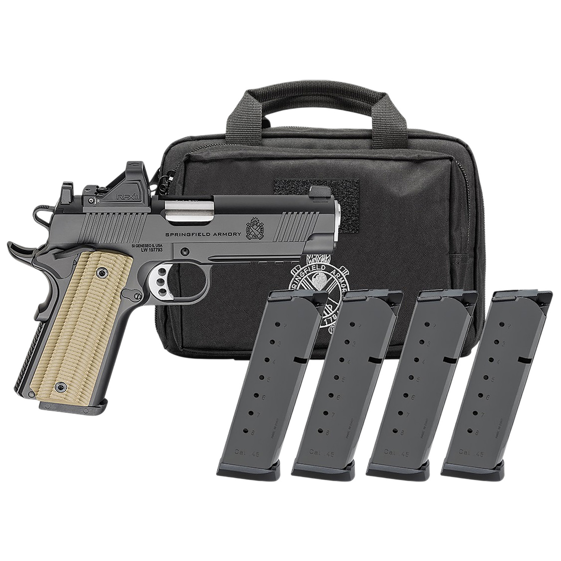 Springfield 1911 Operator 45ACP 4.25″ AOS 8rd Black; Scalloped G10 Grips; Gear PAC: Viridian RFX11 Green Dot Optic; Premium Pistol Bag; 4x8rd Magazines