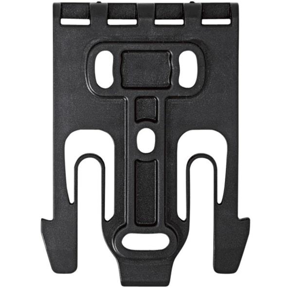 The QLS 19 Locking Fork mounts directly to the back of any Safariland 2-hole pattern pouch or 3-hole pattern holster. The combination can then be connected to either the QLS 22 or QLS 22L Receiver Plate. Use with either of these receiver plates allows for quick transfer of holster between attachment points such as a belt loop tactical leg shroud or other stable mounting platform. The QLS fork and plate combination passes the Level I Retention pull test.