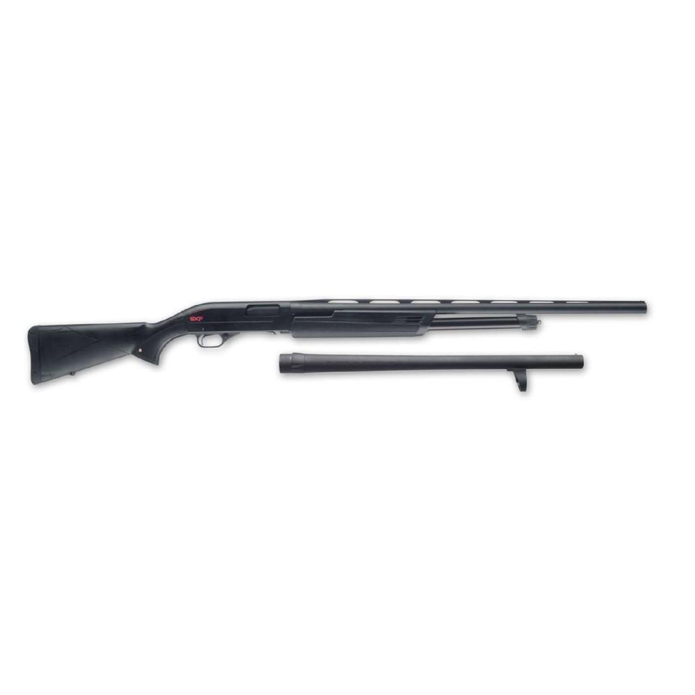 Pick up the Winchester SXP Combo shotgun and experience the light weight centered balance and instant pointability firsthand. The Super X design provides you with the fastest follow-up-shots. No other pump offers the feeling of an inertia-assisted slide-action that can deliver three shots in a half second. It has an aluminum alloy anodized black finish chrome plated chamber and bore black chrome on exterior surface black synthetic stock and Ivory front bead sight. The combo comes with a 26" barrel and a 18" Defender barrel. The capacity is 5+1 with 2 3/4" shells. The SXP also comes with three choke tubes (F M IC).